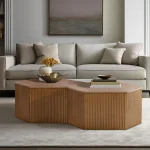 Elevate your home decor with the Ink + Ivy Hexagon Wood Coffee Table, a striking centerpiece that adds both style and functionality to any living space. Its unique hexagonal design makes a bold statement in small areas, while its modular shape offers endless possibilities for creative arrangements. The natural wood color and visible oak woodgrains exude rustic charm and create a warm, inviting atmosphere. Featuring a modern twist with its carved, fluted exterior, this table seamlessly blends contemporary and traditional styles. Its hollow interior ensures practicality and easy mobility, while adjustable levelers provide stability on uneven surfaces. Assembly is quick and hassle-free with the included allen wrench. Enhance your living space with this versatile and exquisite accent table that brings sophistication and character to any room. Please note that due to the natural variations in wood, each piece may have unique color and graining, adding to its individual charm.